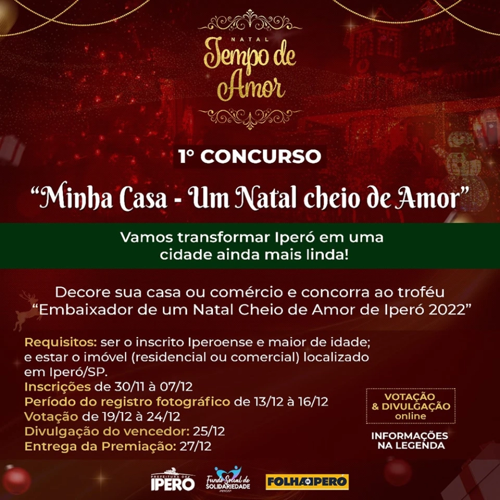 A prefeitura de Iperó, por meio do departamento de Cultura, vem informar que estão abertas as inscrições, até 07/12, para o Concurso de Decoração Residencial e Comercial de Natal.