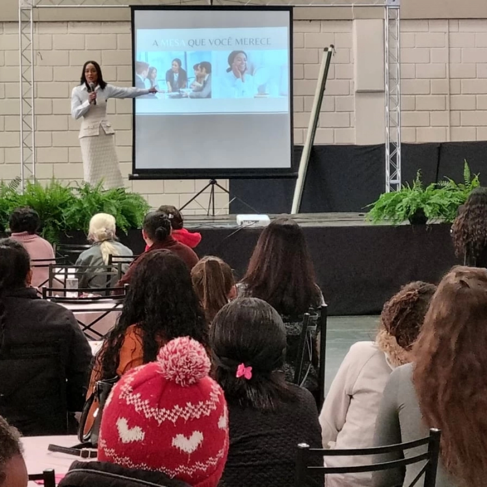 A palestra foi ministrada pela Dra. Geisa Barros, médica africana com especialização em estética, que trouxe um olhar sensível sobre temas importantes para o fortalecimento, escuta e acolhimento das mulheres.